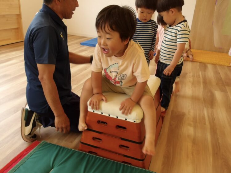 今日は初めての跳び箱に挑戦!少し高い台ですがみんな怖がることなく登っていきます!