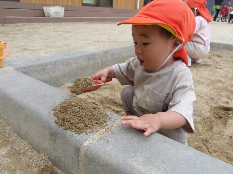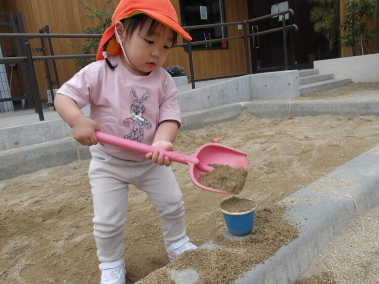 砂場は今日も大人気。以前より道具を使って遊ぶ姿が見られましたよ。より具体的なあそびに発展していますね。