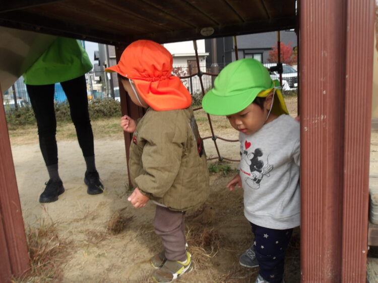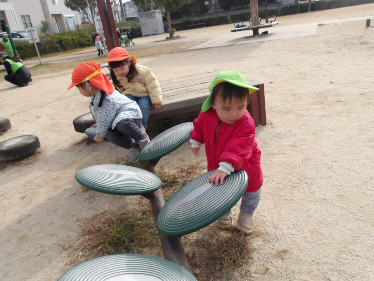 あひる、ひよこ組は公園までお散歩に行きました。久しぶりの公園に嬉しそうな子どもたち♫