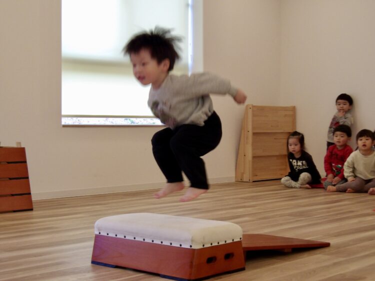 今回も跳び箱に取り組みました。みんな上手に踏み切って高く飛んでいます。