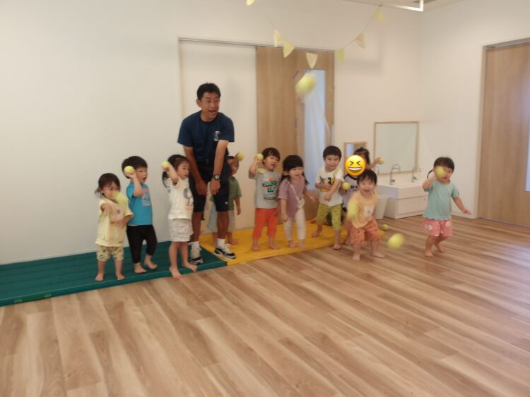 最後はボールを使ったよ!先生から投げ方を教わって「1、2、3!」