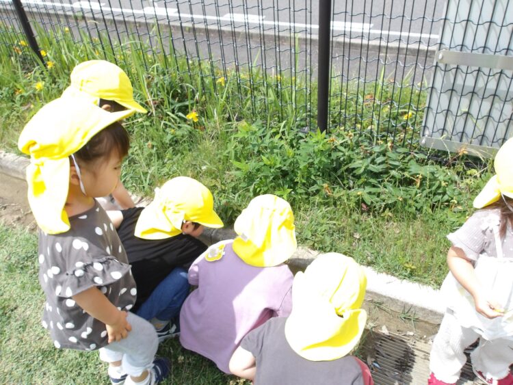 ダンゴムシや蟻を見つけてお友だちと見せ合いっこをしたり、観察をして楽しんでいましたよ☺️