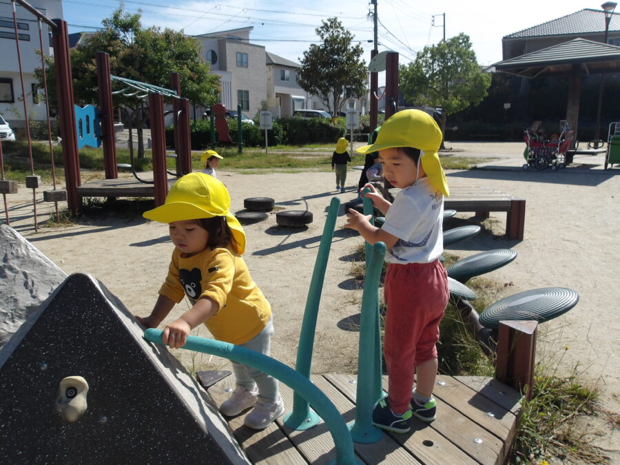 保育士と一緒に遊具で遊んだり、