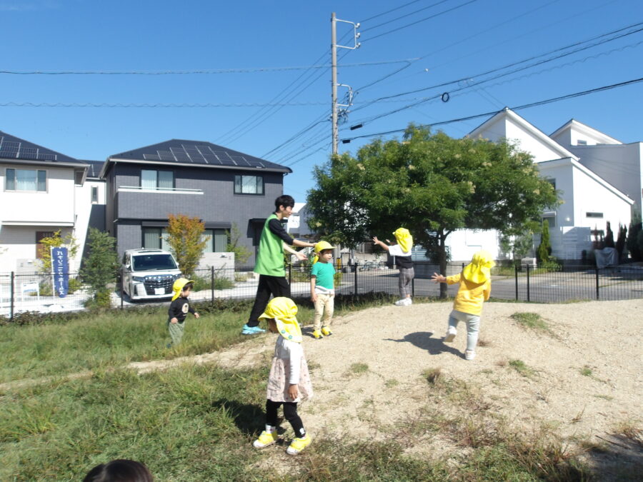 以前は山の登り降りで保育士と手を繋いで一緒に登っていたみんなですが、だんだんと手足の力がついてきて、今日は保育士に見守られながら力強く登っている姿が見られました