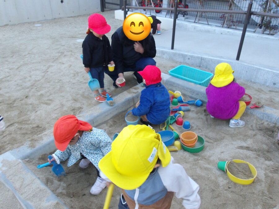 園庭ではまず砂遊びをして遊びました!お砂で大きなケーキを作って楽しかったね!次は手押し車で遊んだよ!