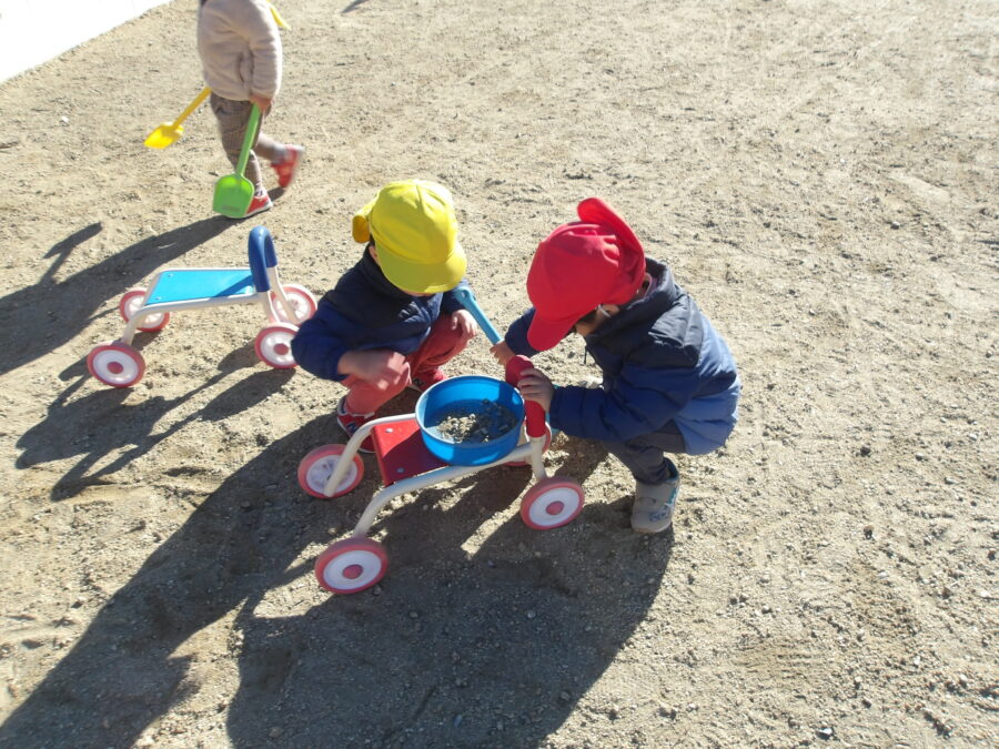 次はコンビカー! 子どもたちは大事なものをコンビカーに乗せて運んだり、コンビカーにまたがりドライブを楽しんだりしていました![]()