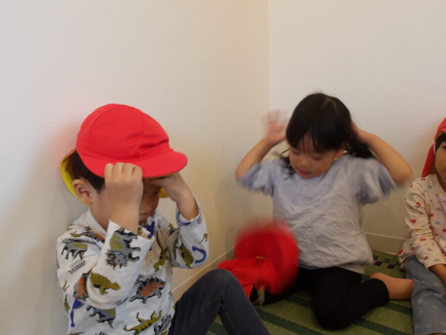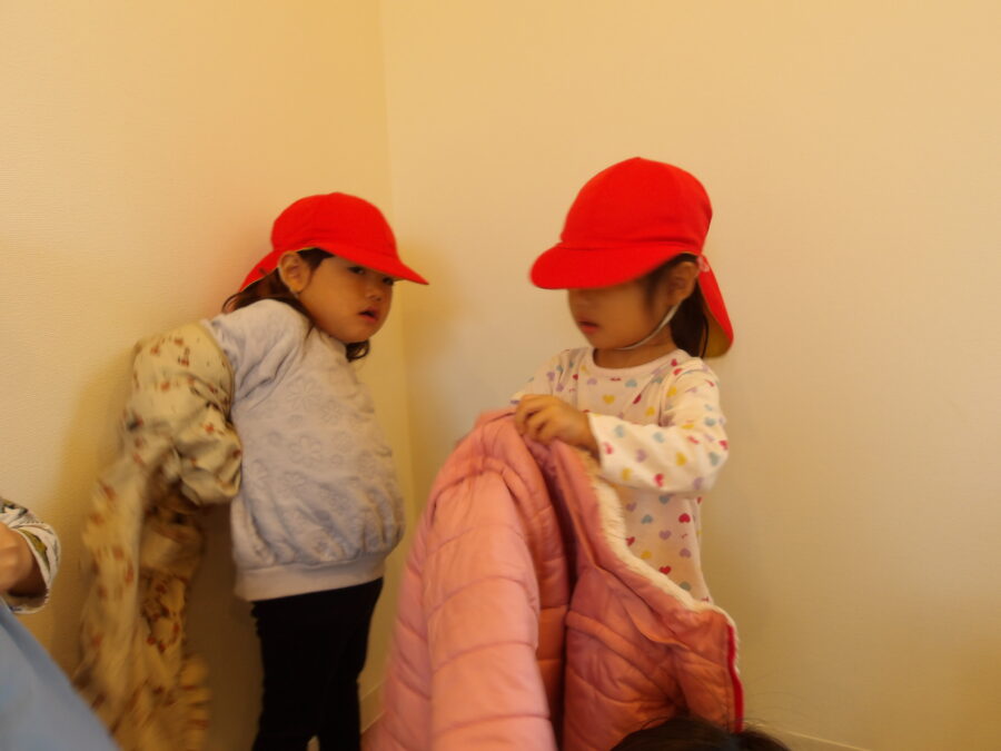 うさぎ組さんやあひる組さんは戸外遊びの準備の仕方が少しずつわかってきて、自分から進んで帽子を被ろうとしたり、上着を着て見ようとしたりと頑張っていましたよ
