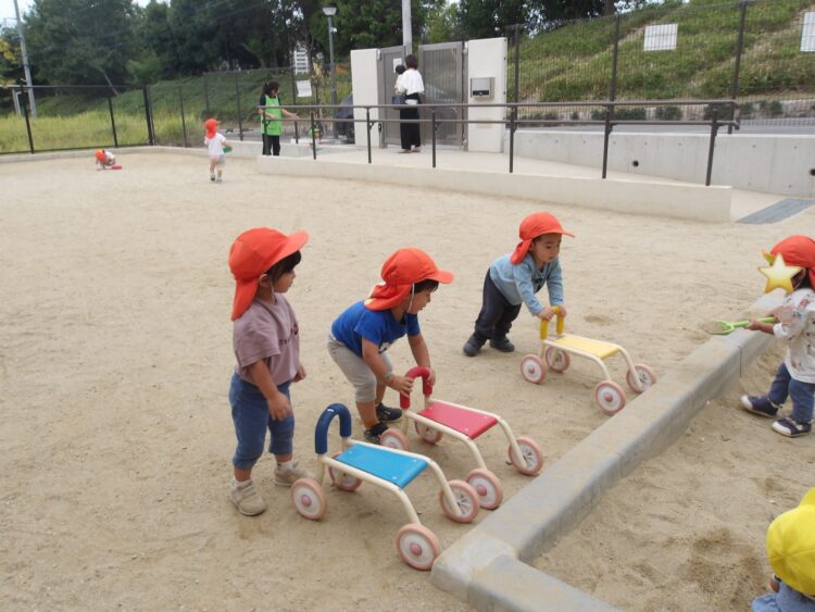 砂場で作ったケーキやごはんを乗せて、配達する姿も見られましたよ。
