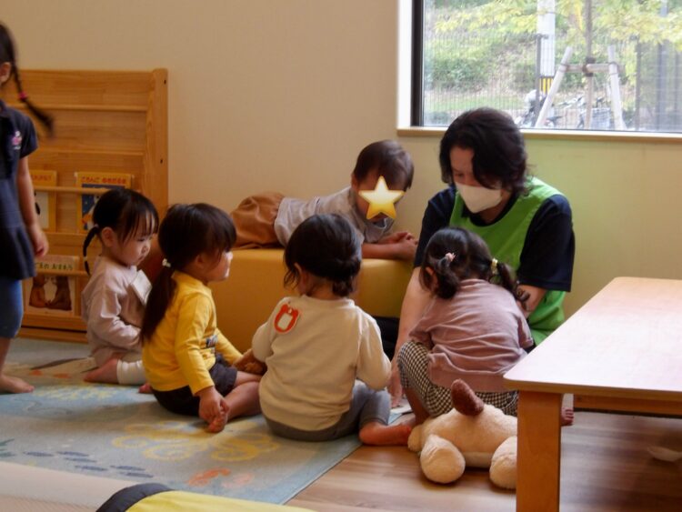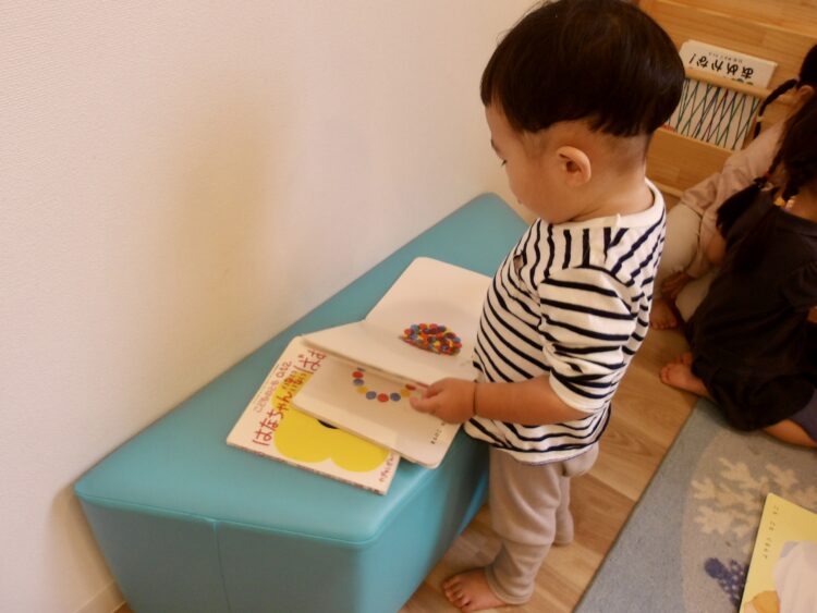 絵本コーナーでは、保育者に気に入った絵本を読んでもらう姿があります。「これ読んで」「次はこれ」と絵本は大人気。