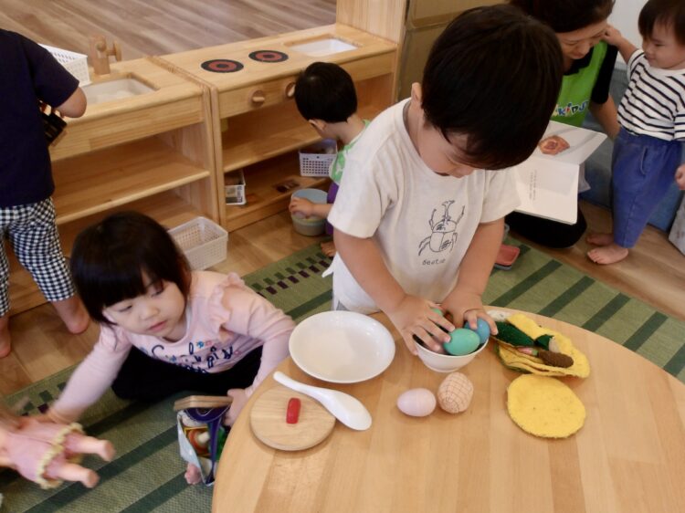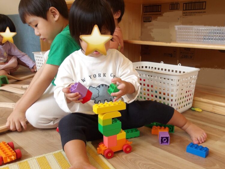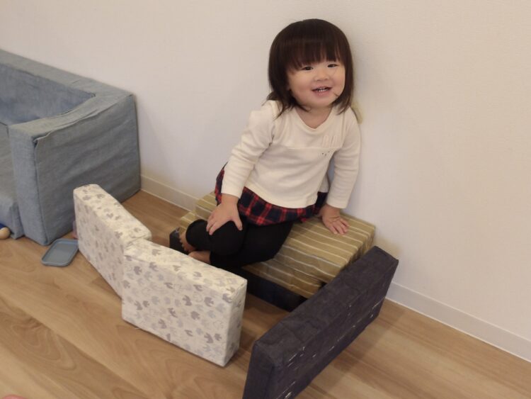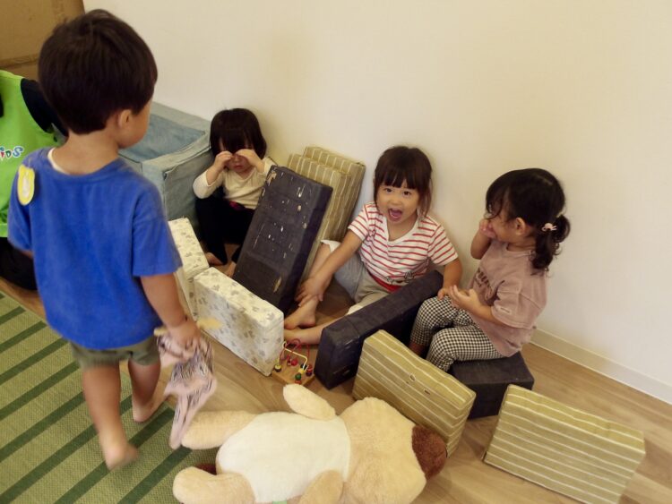 おままごとコーナーではお家づくりをおこなっていました!みんなで囲いを作って、お家ごっこが盛り上がっていましたよ。