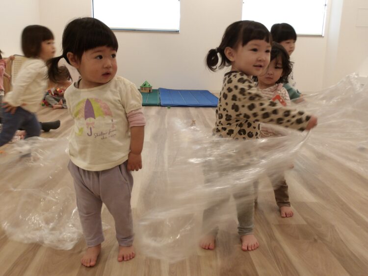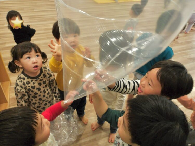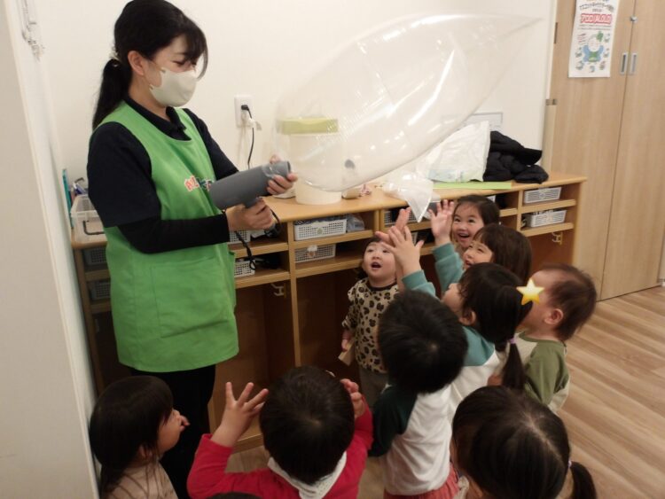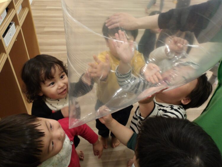 お部屋ではビニールの風船あそびをしました!大きな風船のように袋が膨らむと「わあー!」と歓声があがりましたよ。