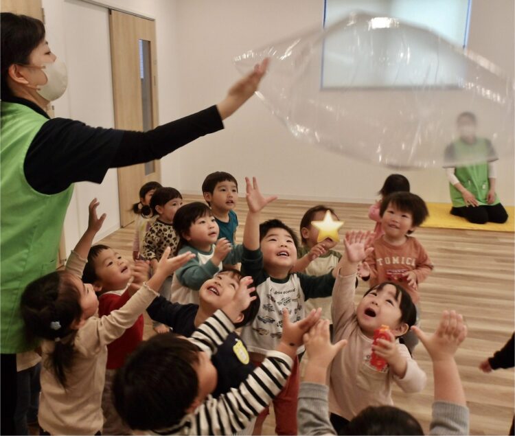 ふわりとゆっくり浮かんだり落ちたりする風船を、楽しそうに追いかけてる子どもたち。