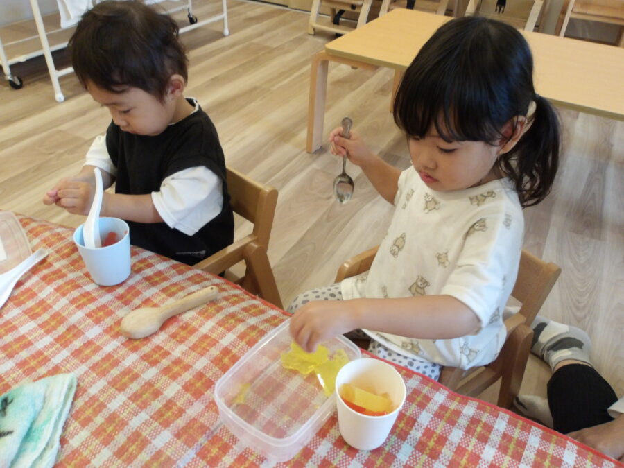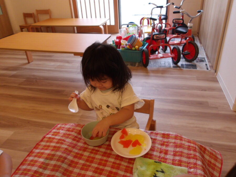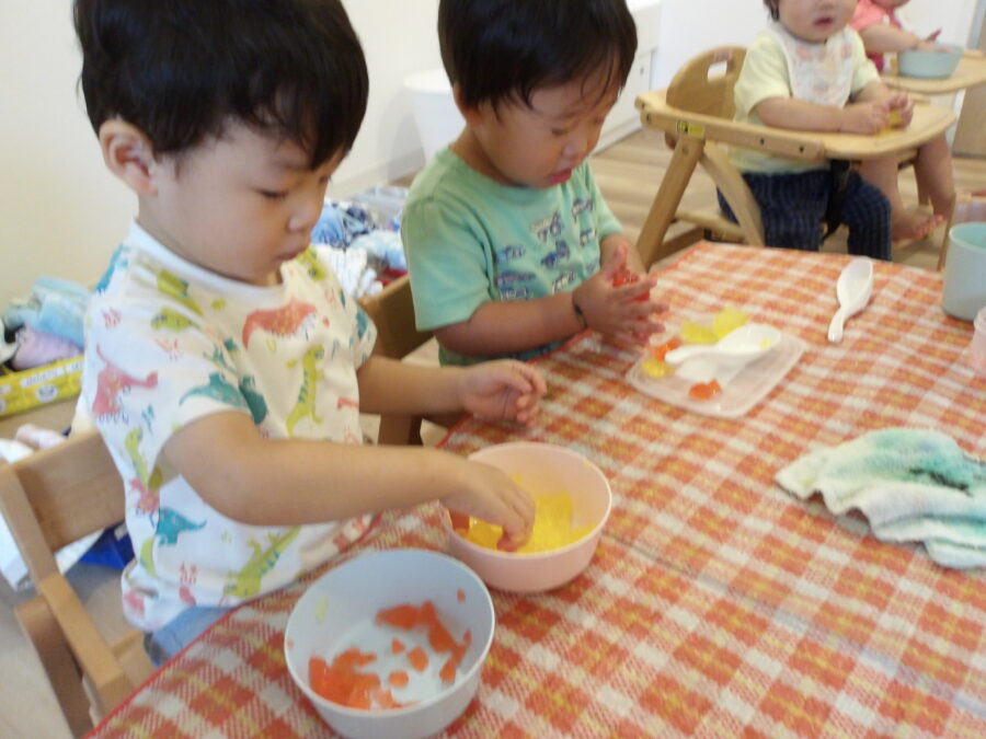 今日は、寒天ゼリー遊びを楽しみました。感触が気持ちよくてプニプニ触っていました。