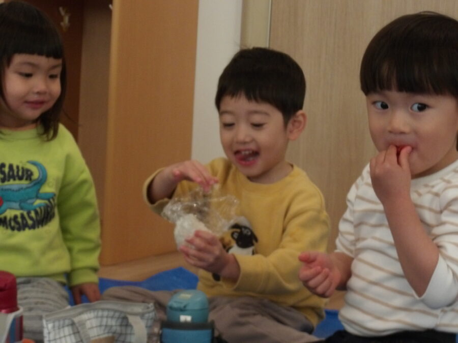 お友だちと見合いっ子しながら食べ、「いちごー😚🍓」「おいぎりー😁」と