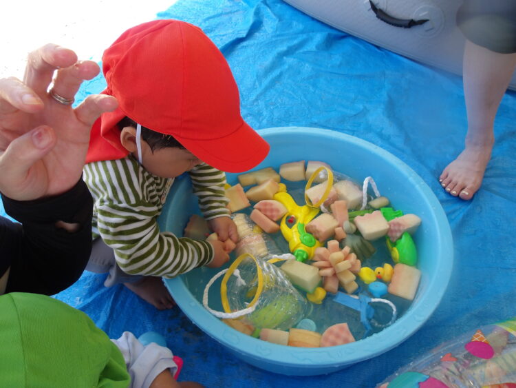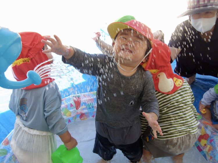 あひる、ひよこ組は水あそび日和!今日も元気に水あそびです✨たくさんのおもちゃから、どれを使おうかな?