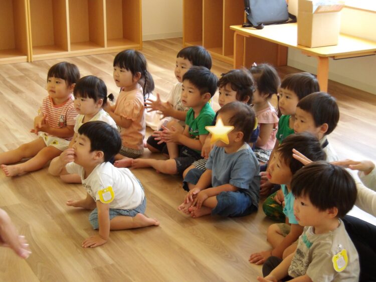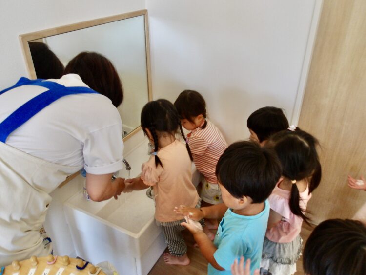 「どんな時に手を洗う?」と聞かれると、「ごはんー」と答えるお友だちも!「ご飯の前や、お外から帰ったときに、手を洗ってる人?」という質問には、「はーい!」と元気よく手を挙げて参加していましたよ。
