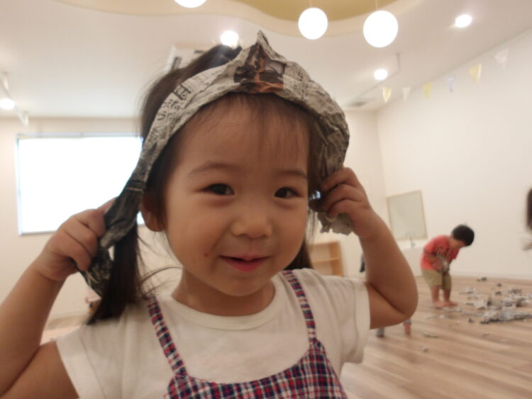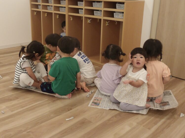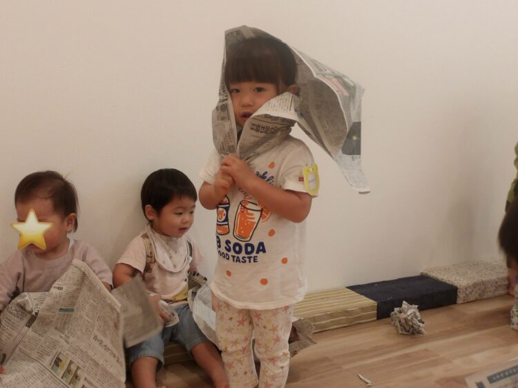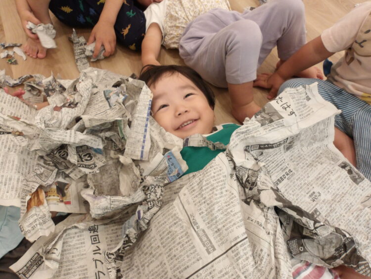 あひる、うさぎ組は新聞紙で遊びました。以前より遊び方が変わって、感触遊びからおままごとの道具になっていったこどもたち。