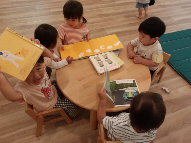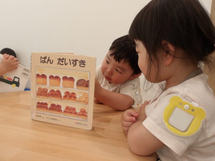 「〇〇ちゃんはどれがいいー?」「これすごいね〜」と盛り上がりながら絵本を楽しんでいました。