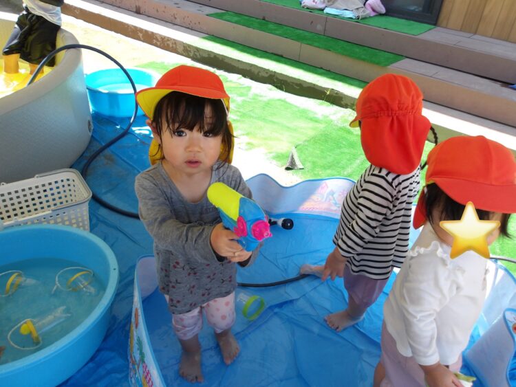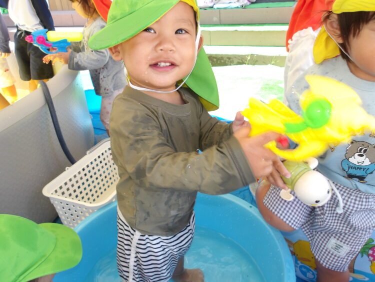 おもちゃの使い方にも慣れてきて、上手に水鉄砲が使える子が増えてきましたよ👏