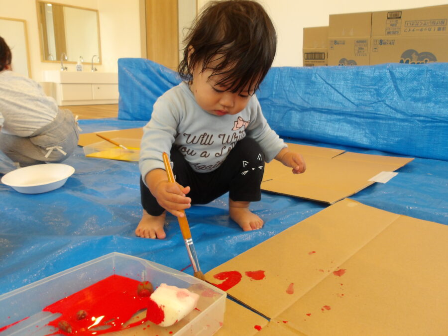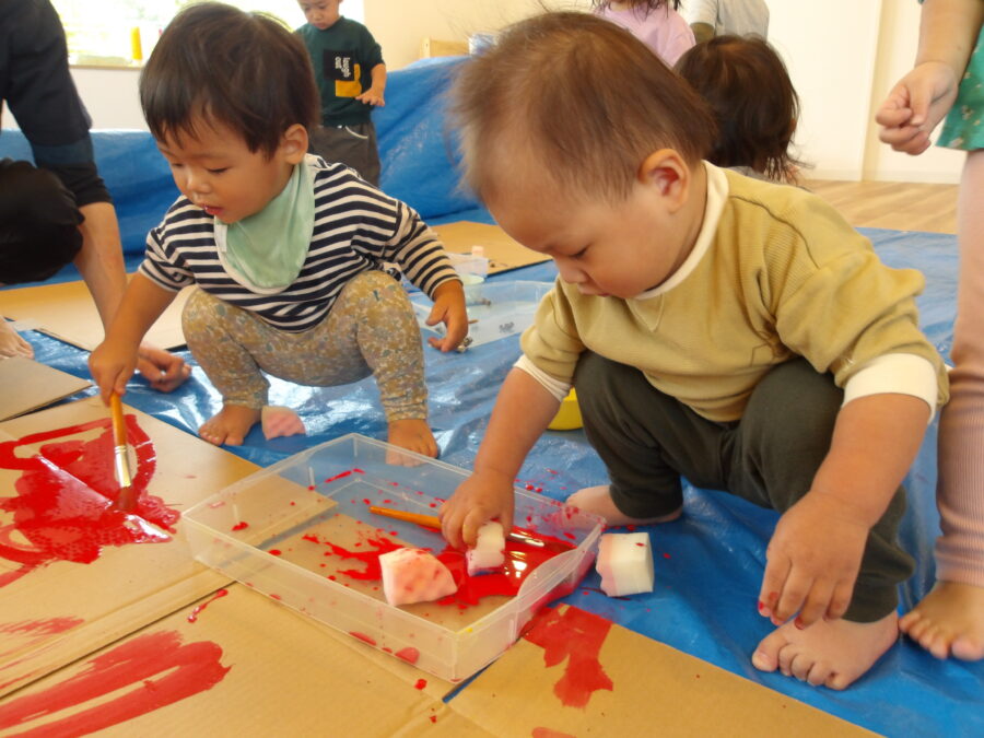 赤、黄、青の絵の具を使い、筆🖌️やスポンジ🧽、どんぐり🌰を使い