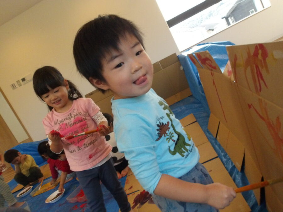 すこしお兄さんたちは壁に貼ったダンボールにもお絵描きをしましたよ😊