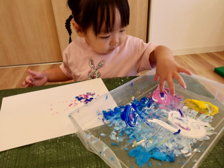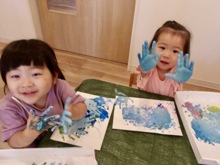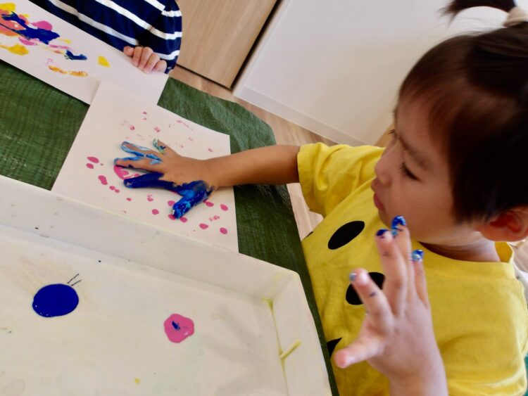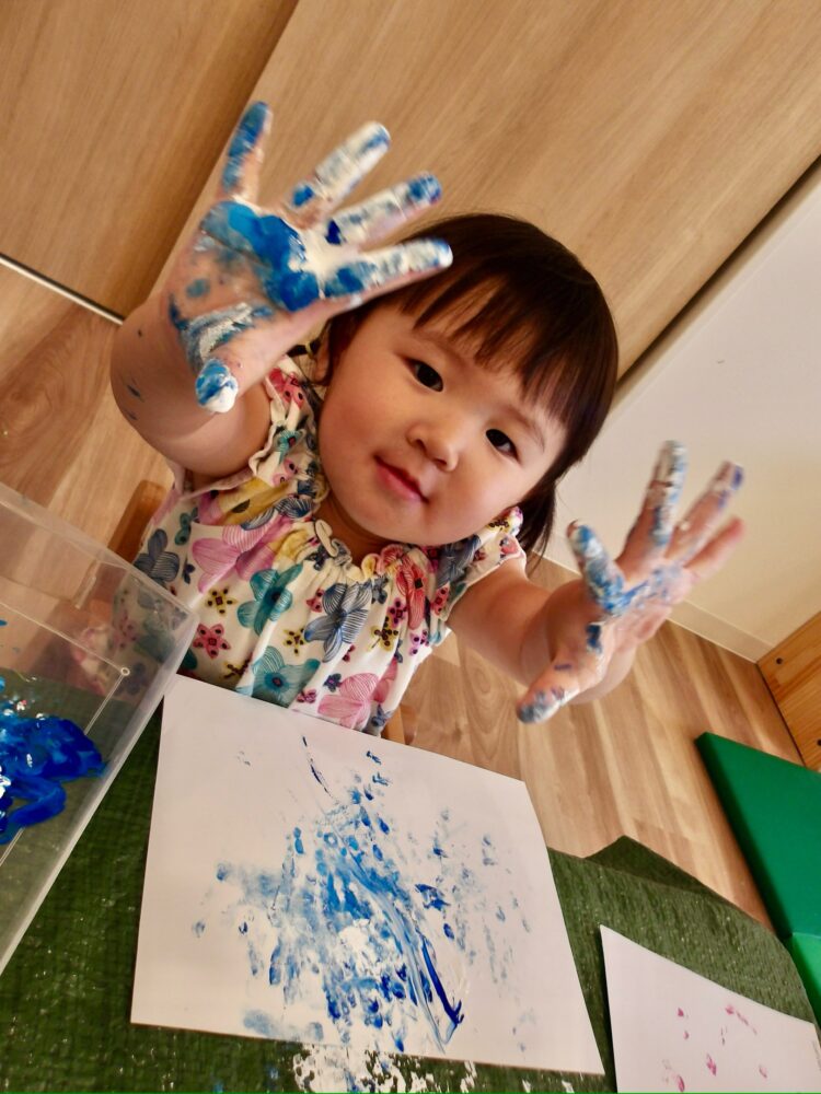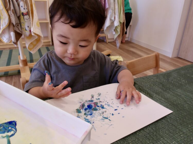 「自由にお絵描きしてみよう!」と始めた絵の具遊び。筆や道具は使わず、手や指を使って、子どもたちの“やってみたい!”を大切にスタートしました。