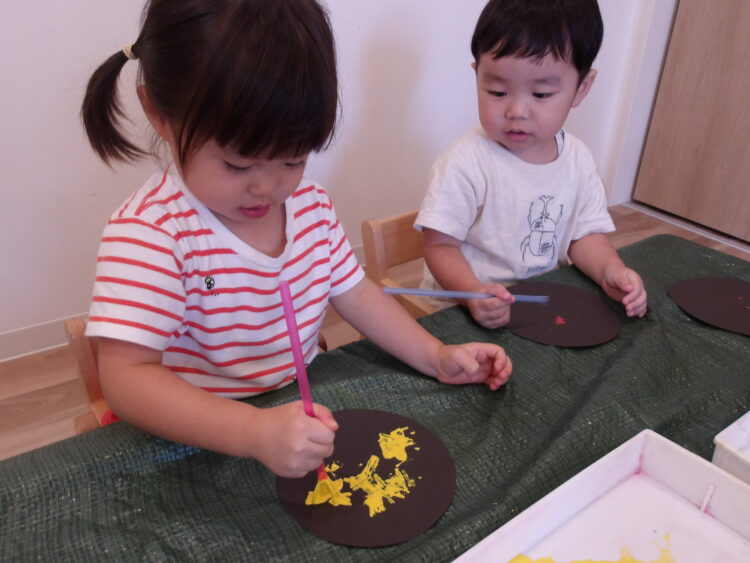 使い慣れないストローでチョンチョン、と絵の具を広げながら色のつき方を珍しそうに眺めていましたよ。