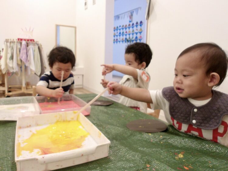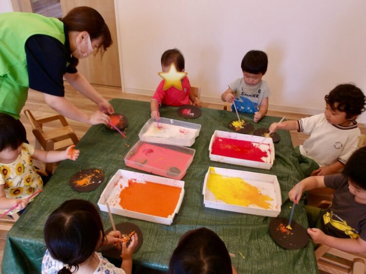 今日はみんなで絵の具遊びをしました。