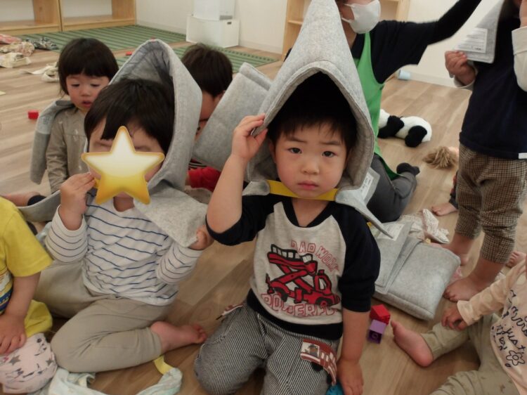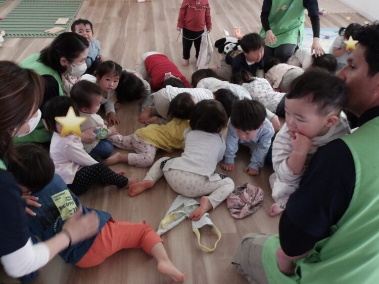 初めての避難訓練に驚いて泣けてしまった子もいましたが、最後に「地震が起きたら、せんせいのお話をよく聞いてね」というお話に頷きながら聞いてくれていましたよ。