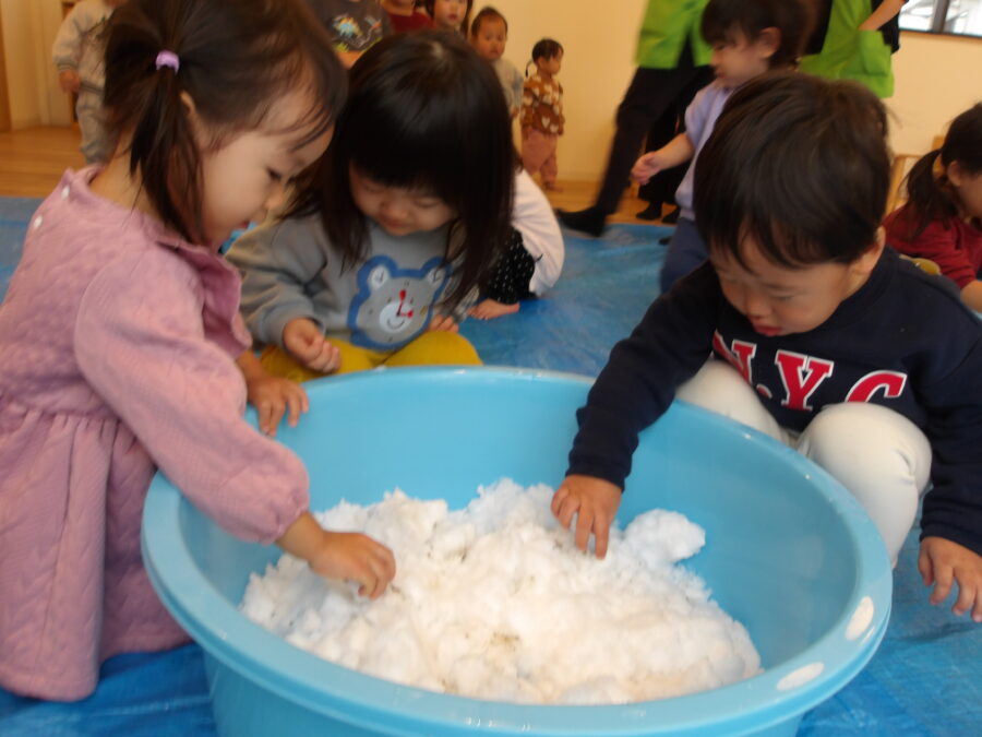 今日はお部屋に雪を持ってきて感触遊びを楽しみました!