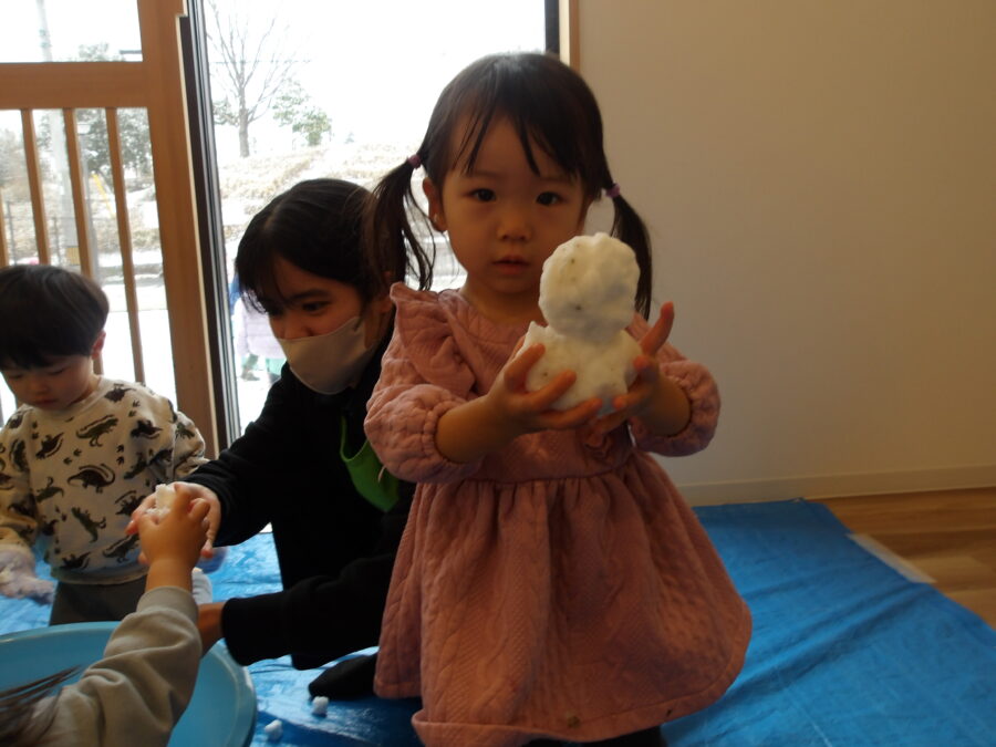 指先でツンツン! 触って見たら冷たかったね!先生見て見て〜! 雪だるま作ったよ! 可愛い雪だるまを見せてくれましたうさぎ組は園庭に出て遊びました!