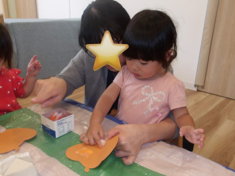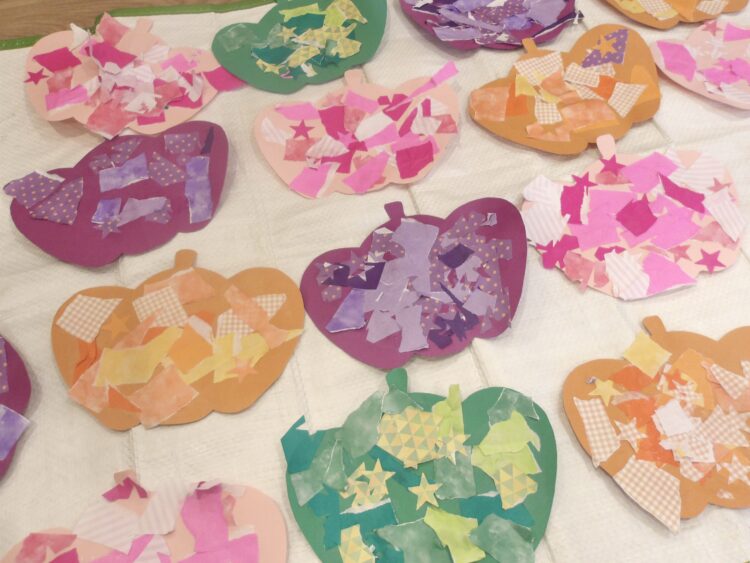もうすぐハロウィンということで、糊を使って好きな色のパンプキンに飾り付けをしましたよ。