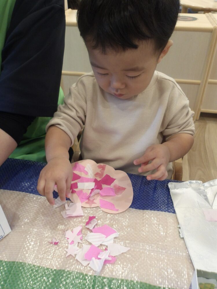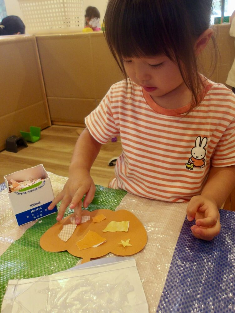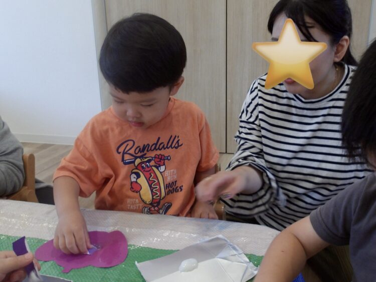 糊の感触にも慣れ、夢中で貼り付ける姿がありました。
