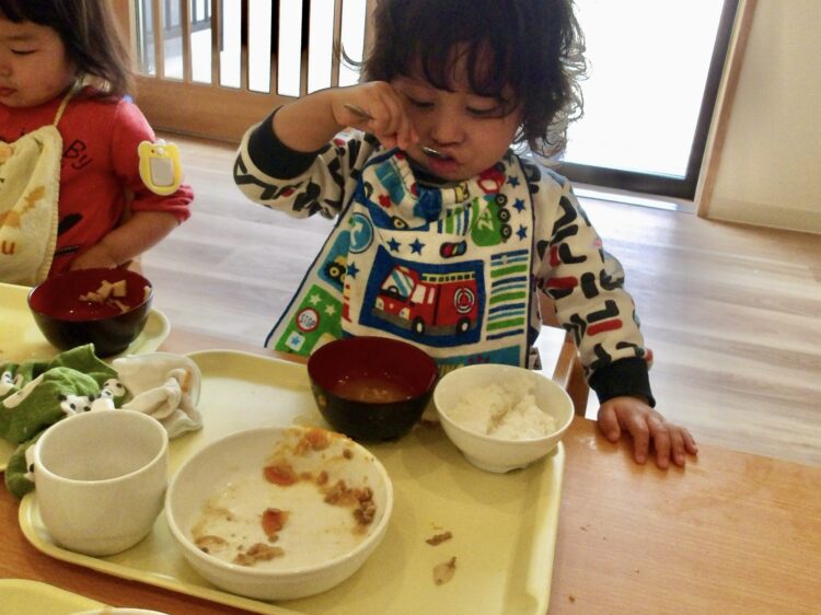 楽しくご飯を食べながらも、それぞれのペースで食具を使ったり、汁物のお椀を持って飲んだりと、挑戦する姿がありますよ♪