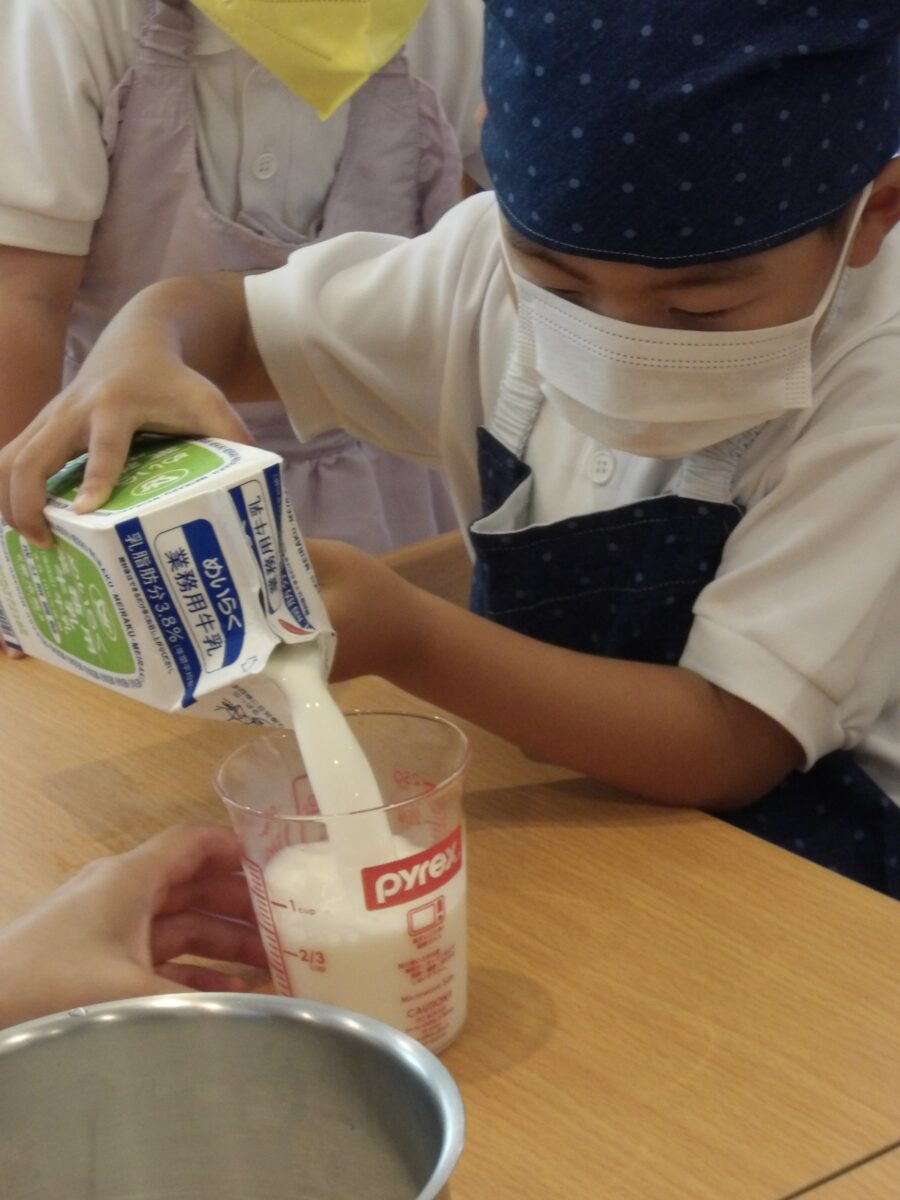 計量した牛乳の中に砂糖を入れていきます。