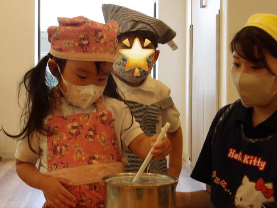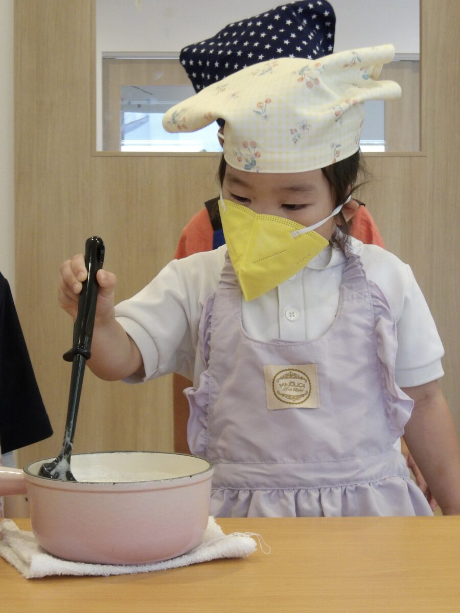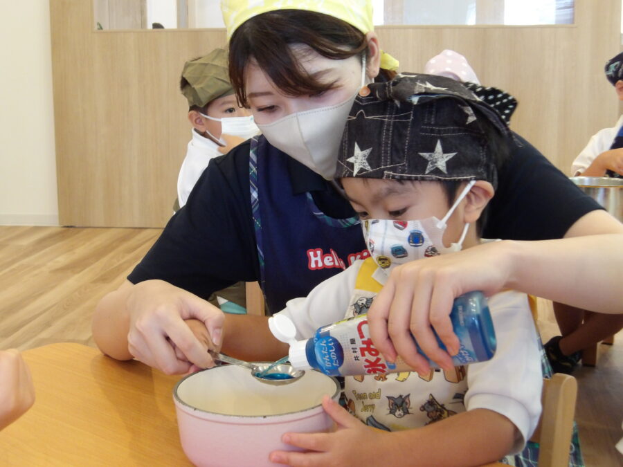 隣のテーブルでは保育者と一緒に大さじスプーンでシロップをお鍋に移しています。