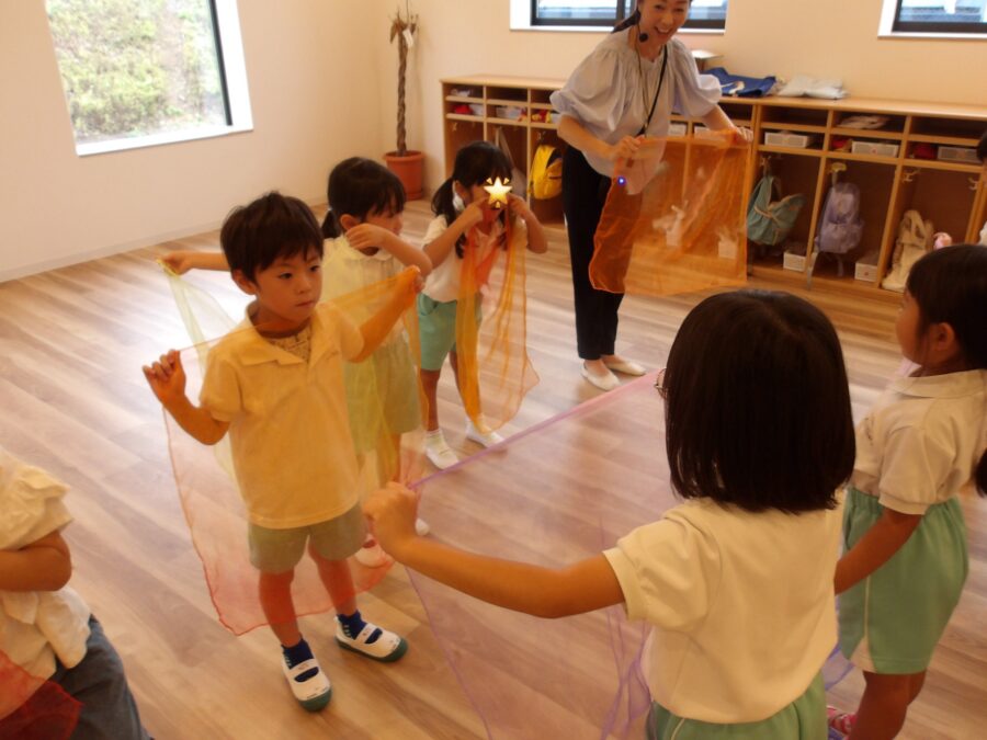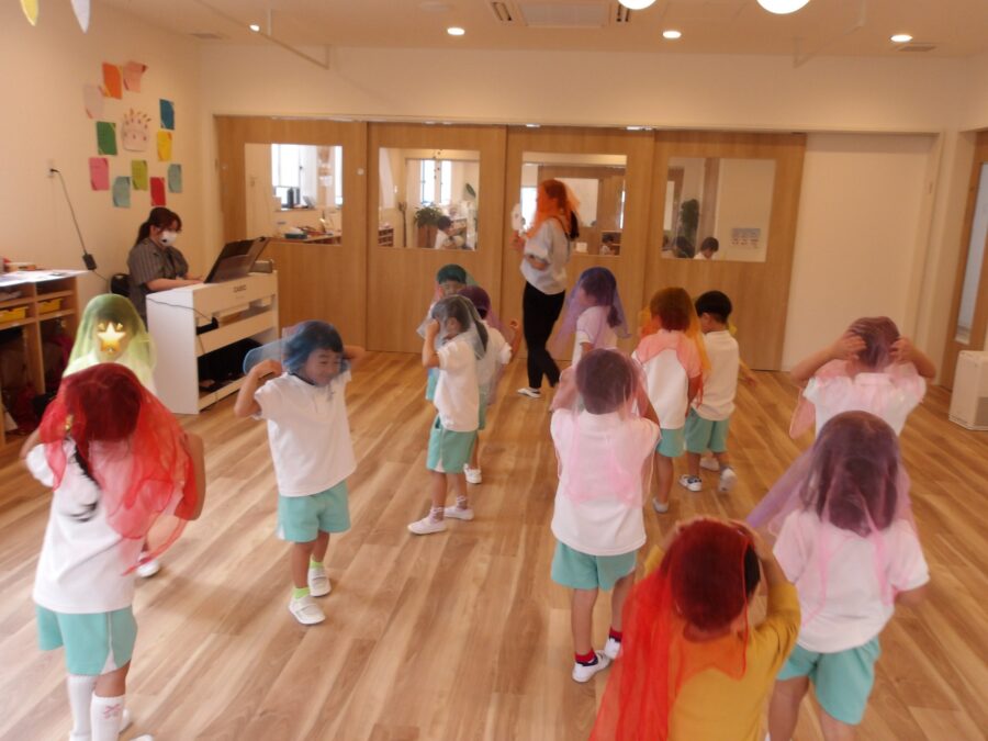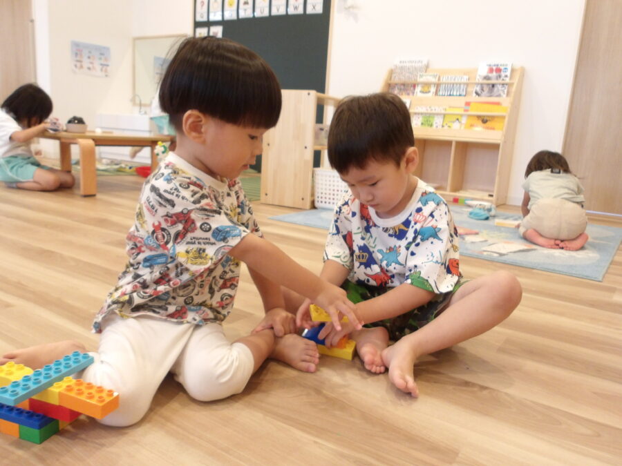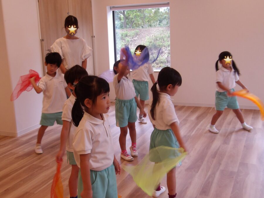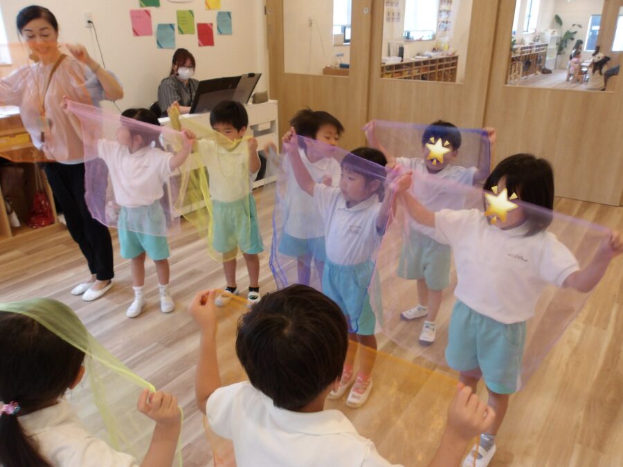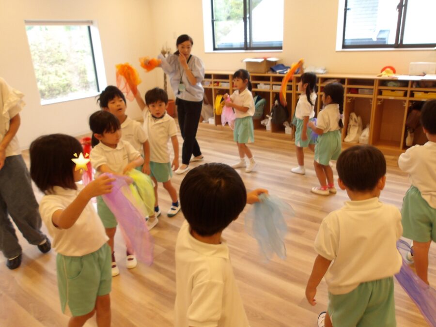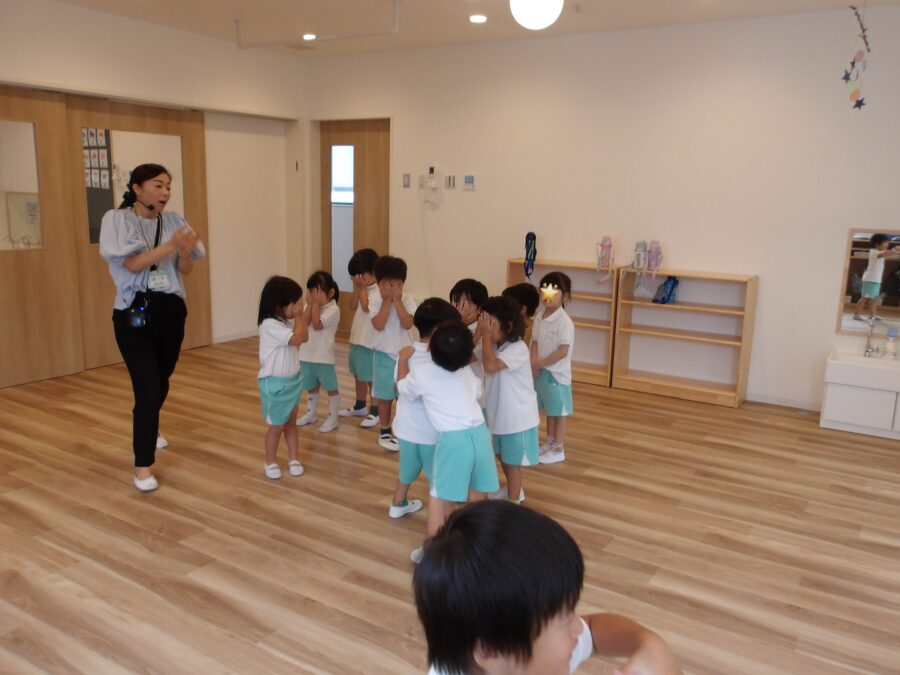 幼児クラスがリトミックを楽しんでいる間、うさぎ組は室内あそびを満喫。