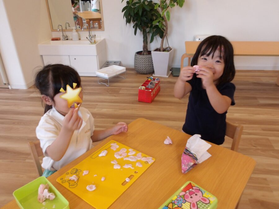 幼児クラスのお姉さんに粘土を貸してもらい、嬉しそうな姿も😊