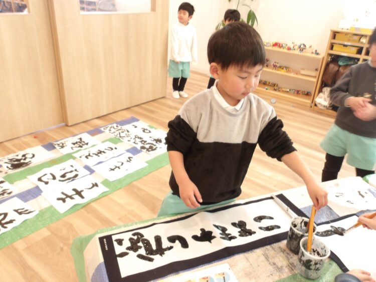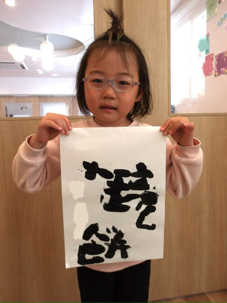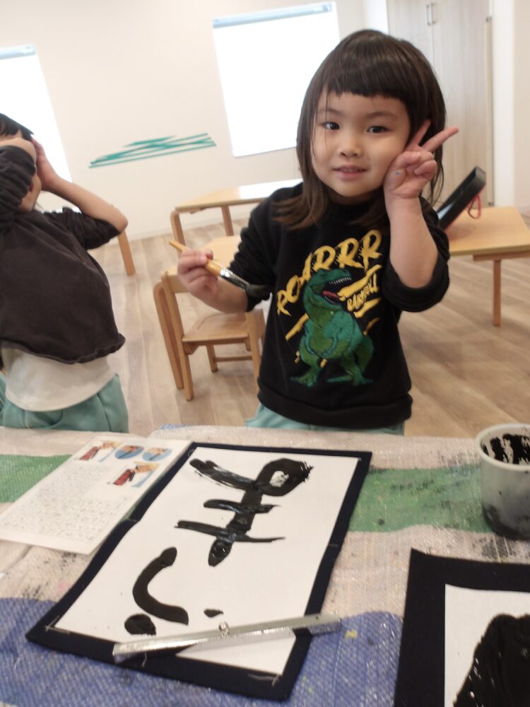 書き初めとは何かを伝えると、「字書けない〜🙁」と不安になる子もいたのですが、保育者が文字や線を書いてみせると、「ちょんちょんやってみたいー!」と線や点を書くことを楽しみました。