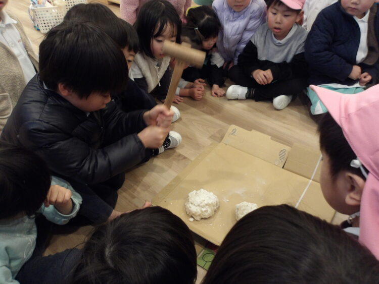鏡開きとは何か、「運を開く(開運)、ラッキーになるんだよ」と子どもたちに保育者が説明していると、「大吉ってこと?」と声が上がり、