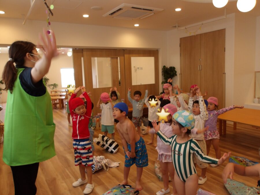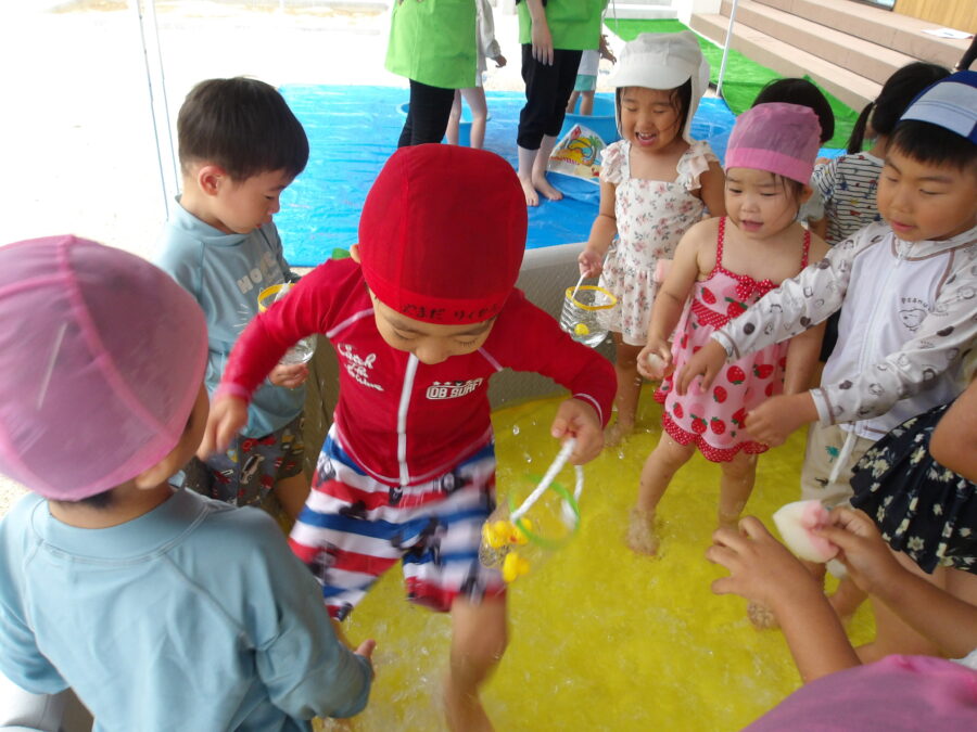 慣れてくると玩具で遊んだり、バシャバシャと水をかけ合ったりお友だちと楽しそうな様子がたくさん見られました!