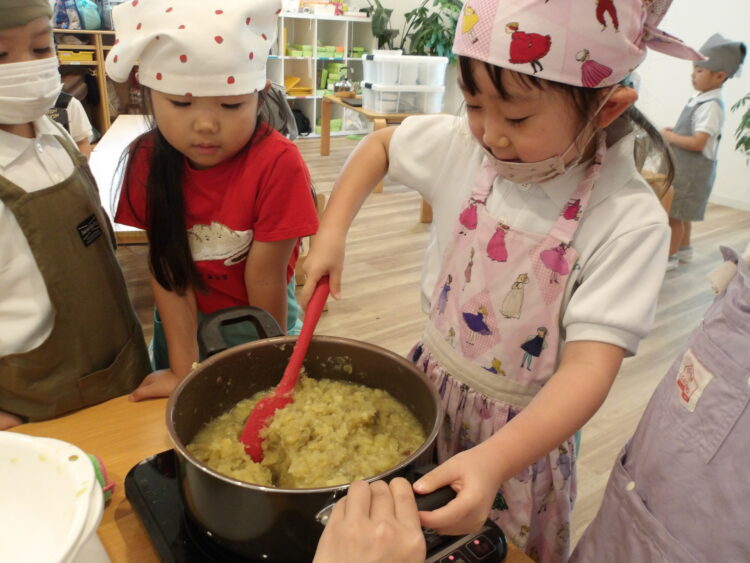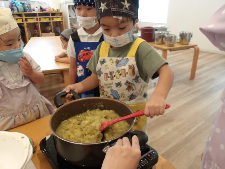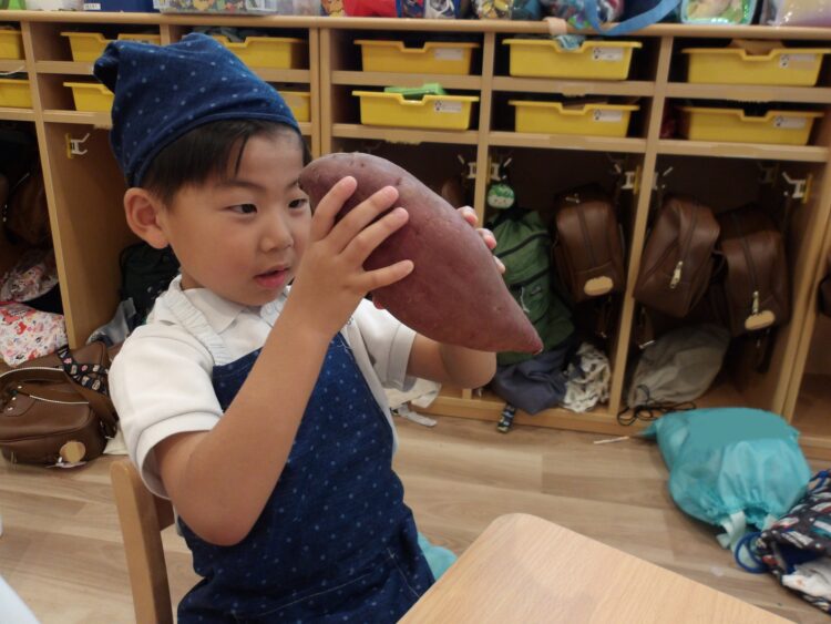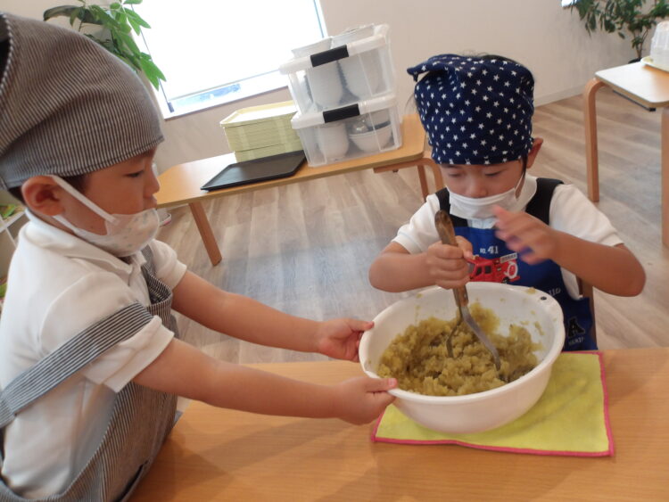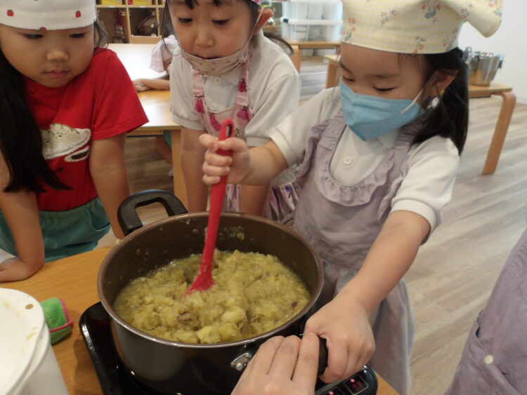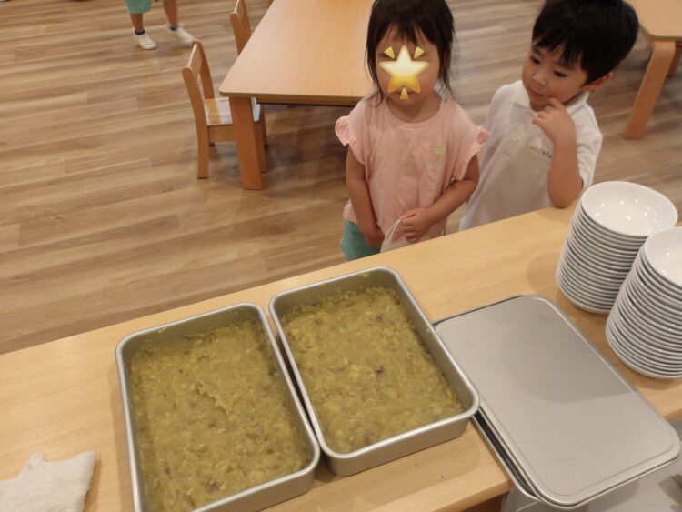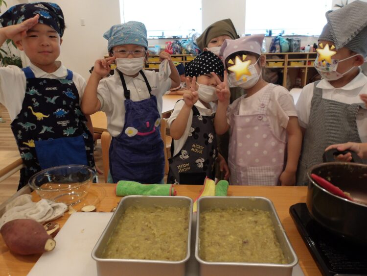 そら組がきのこを使ったことに対し、にじ・たいよう組はさつまいもを使って芋ようかんを作りましたよ。