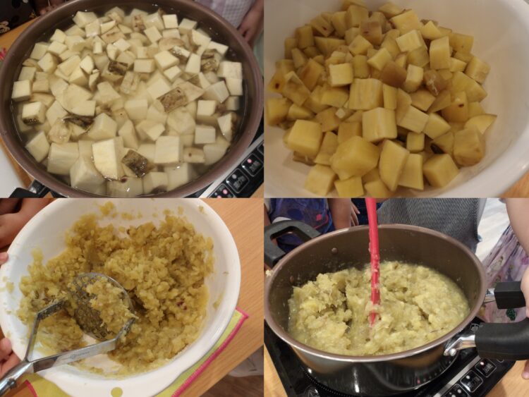 茹でたお芋をマッシャーで潰していきます。