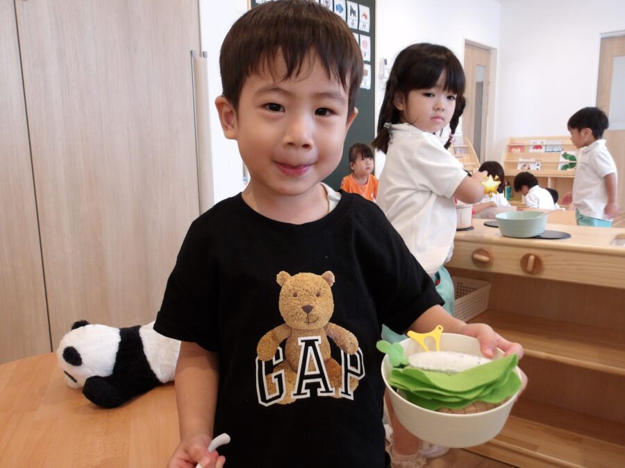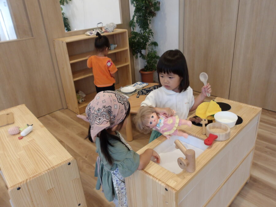 環境が変わって新鮮さのある保育室でそれぞれおままごとやブロックなどを楽しんでいました。