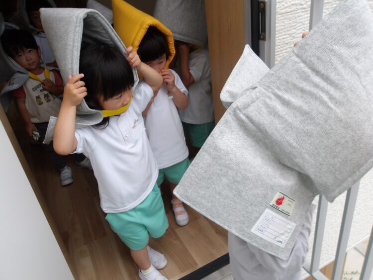 防災頭巾を自分で身につけることができました。
