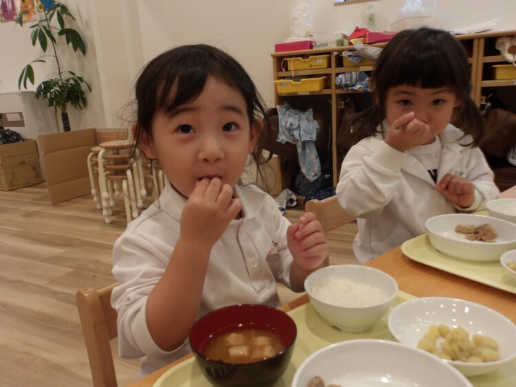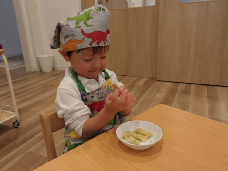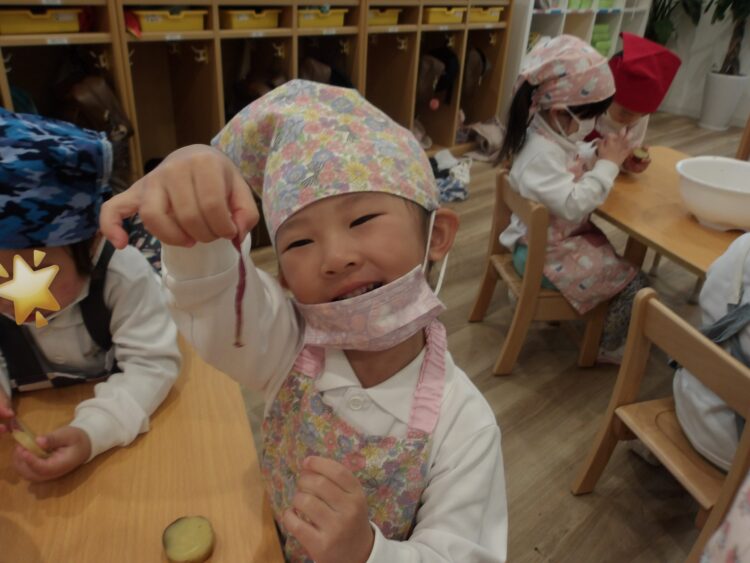 茹でたさつまいもの皮剥きをすると、ぺろんとめくれるのが面白かったようで、剥いた皮を嬉しそうに見せてくれる姿がたくさん見られました。