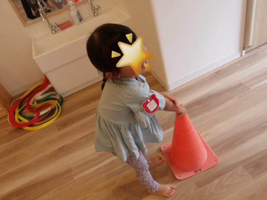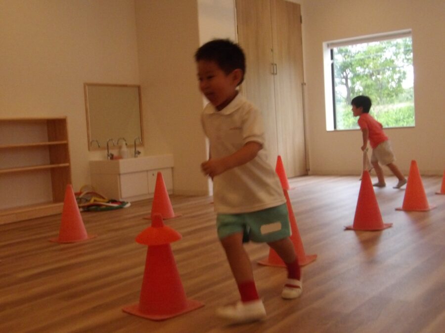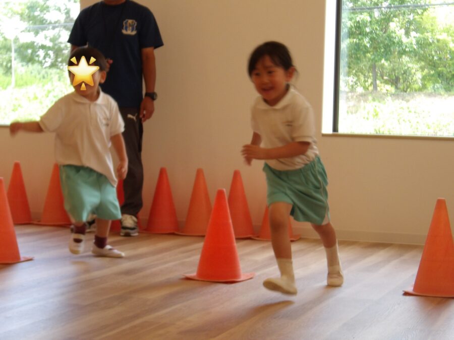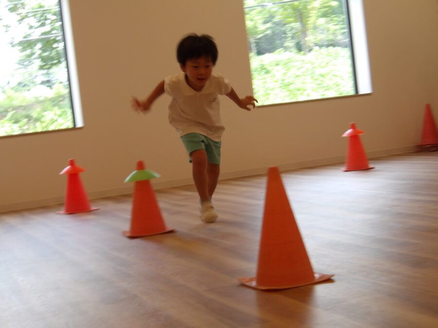 また、「オレンジ、緑、白」と先生が指定する順番にコーンをタッチして走る運動もしました。