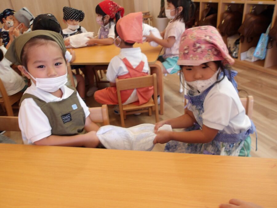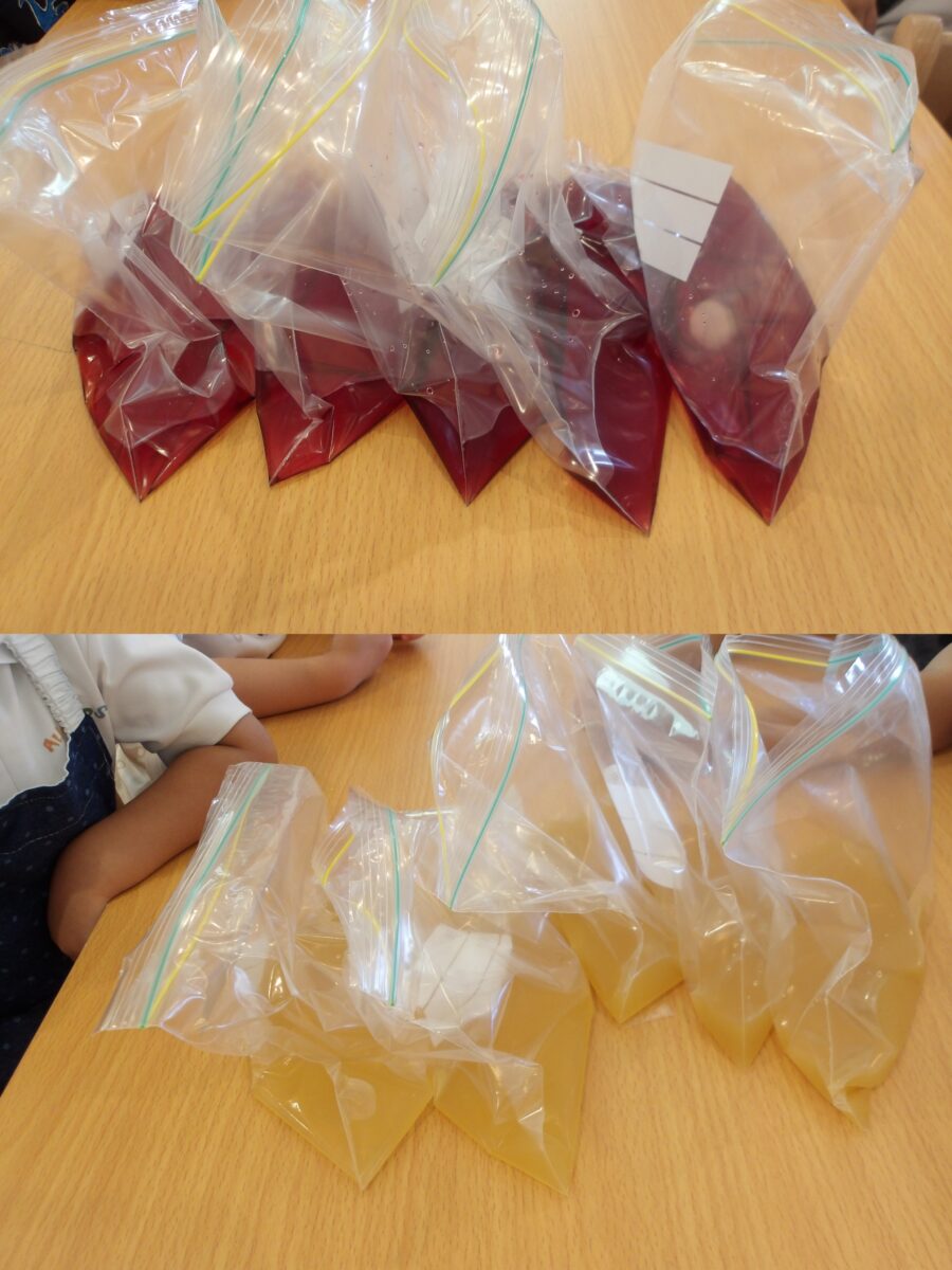 ジュースを包んでいる氷とお塩が子どもたちには重たくて、休憩しながら振ったり、机に置いたままゆすってみたりしていました。