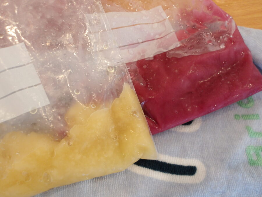 ジュースを入れた袋を氷とお塩の袋で包んだら、あとはとにかく振るだけです。