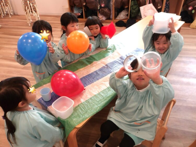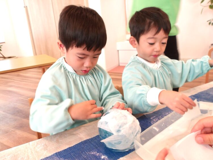 「先生こんな感じ?」「ここまで出来た〜!」「先生・・・もう疲れた・・・」と途中経過を教えてくれたり、風船を選んだ子は貼るのが大変だった子もいましたが、保育者と一緒に貼り進めていき、完成が近づくと、「あとちょっと〜!」「できたー!」と喜びいっぱいの様子でした😊